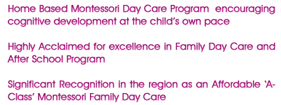 Happy Kidz Montessori Family Day Care is a loving, licensed home-based full time childcare cum preschool program for kids aged 15 months to 5 years old; based on Montessori approach. Montessori discipline focuses on teaching independence, responsibility and self-discipline, as well as encouraging cognitive development at the child’s own pace and stressing the uniqueness of each child. At Happy Kidz, developmentally appropriate learning is the highlight of the childcare program, children learn best when they experience a variety of developmentally appropriate learning activities that incorporate a child’s individual strengths, needs and interests.
